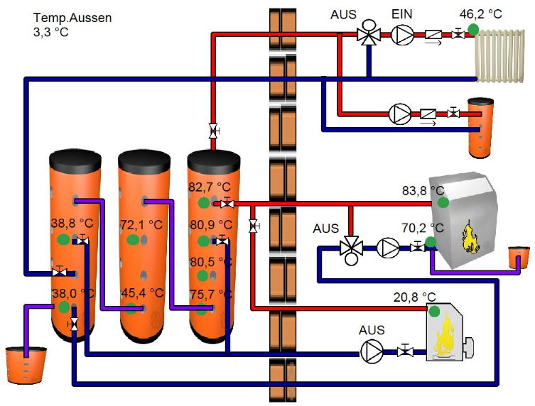 zu 6.: Ja, der erste Puffer ist der der am wärmsten ist. Da wird auch der Heizkreisvorlauf angeschlossen. Der erste wo auch der Heizkreisvorlauf abgegriffen wird, sollte per Ölkessel zu 200-200 Litern erwärmt werden.